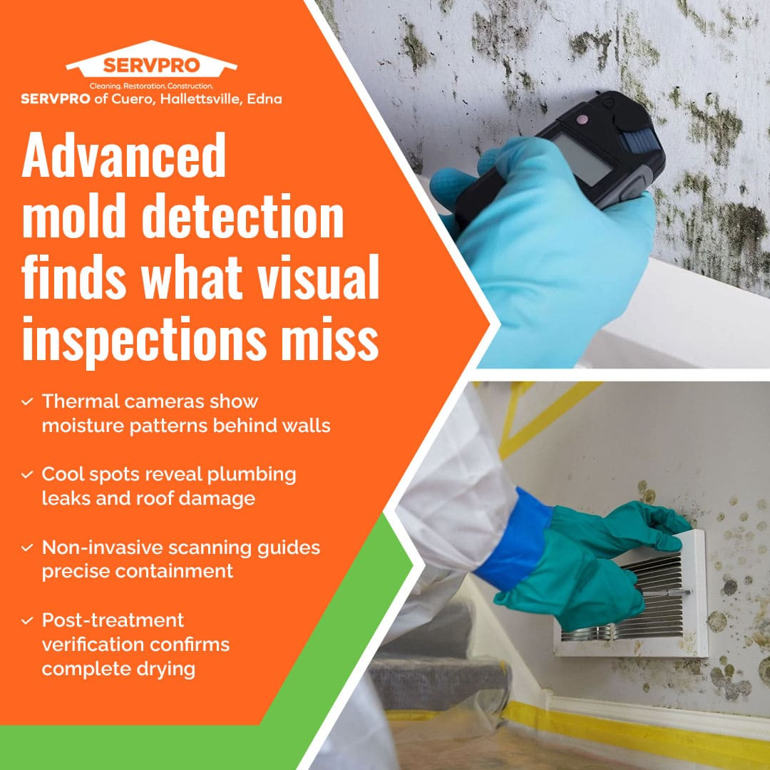 SERVPRO of Cuero, Hallettsville, Edna provides advanced mold remediation services using thermal imaging technology for comprehensive detection throughout South Texas properties. The company responds 24 hours a day, seven days a week, including weekends and holidays. IICRC-certified mold remediation specialists serve residential and commercial properties with proven protocols addressing visible and hidden contamination. Services include thermal imaging assessment, proper containment, safe mold removal, moisture source correction, structural drying, and post-remediation verification confirming successful treatment.